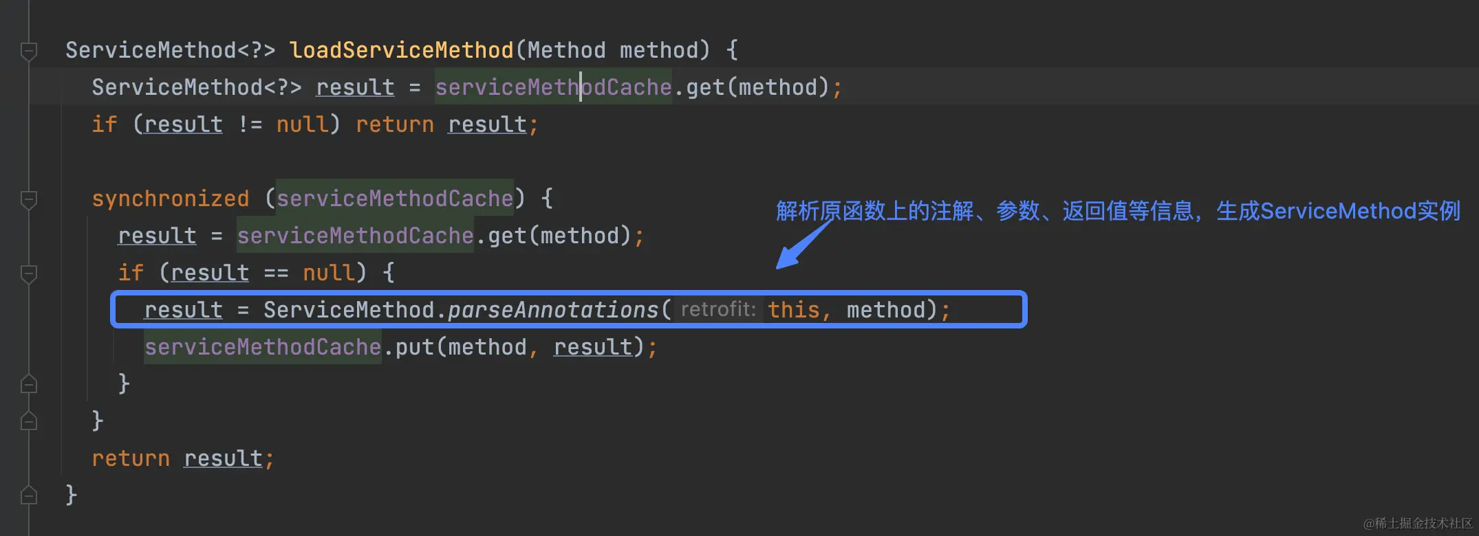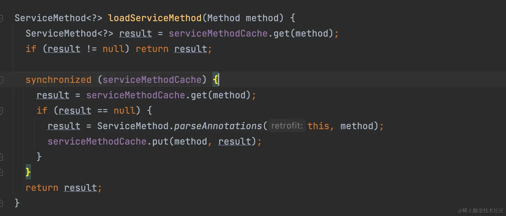 这里首先需要理解为什么这里需要加锁,其目的也是因为parseAnnotations 是一个耗时操作,这里加锁的目的是为了实现类似putIfAbsent的完全原子性操作。 实际上这里加锁可以优化为对应的service 类作为锁对象,将全局的锁优化为相同的service才进行锁等待。 我们可以修改其源码的实现来避免这种场景的锁竞争问题。 该优化已提交到retrofit,并被合入。github.com/square/retr…