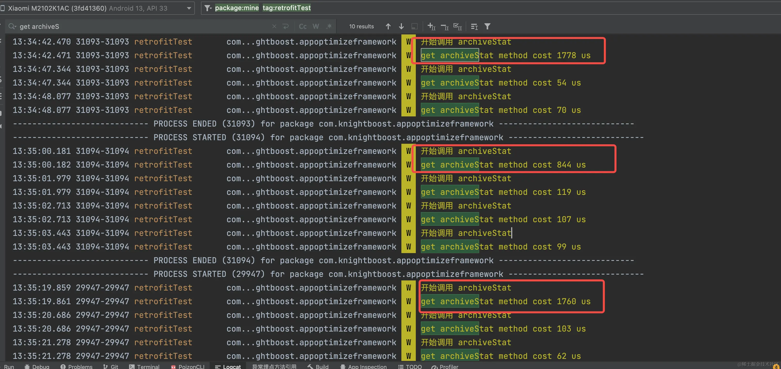 这里我模拟了一个简单的 Service Method, 并调用archiveStat 观察首次调用及其后续调用的耗时,注意这里的调用还未触发网络请求,其返回的是一个Call对象。