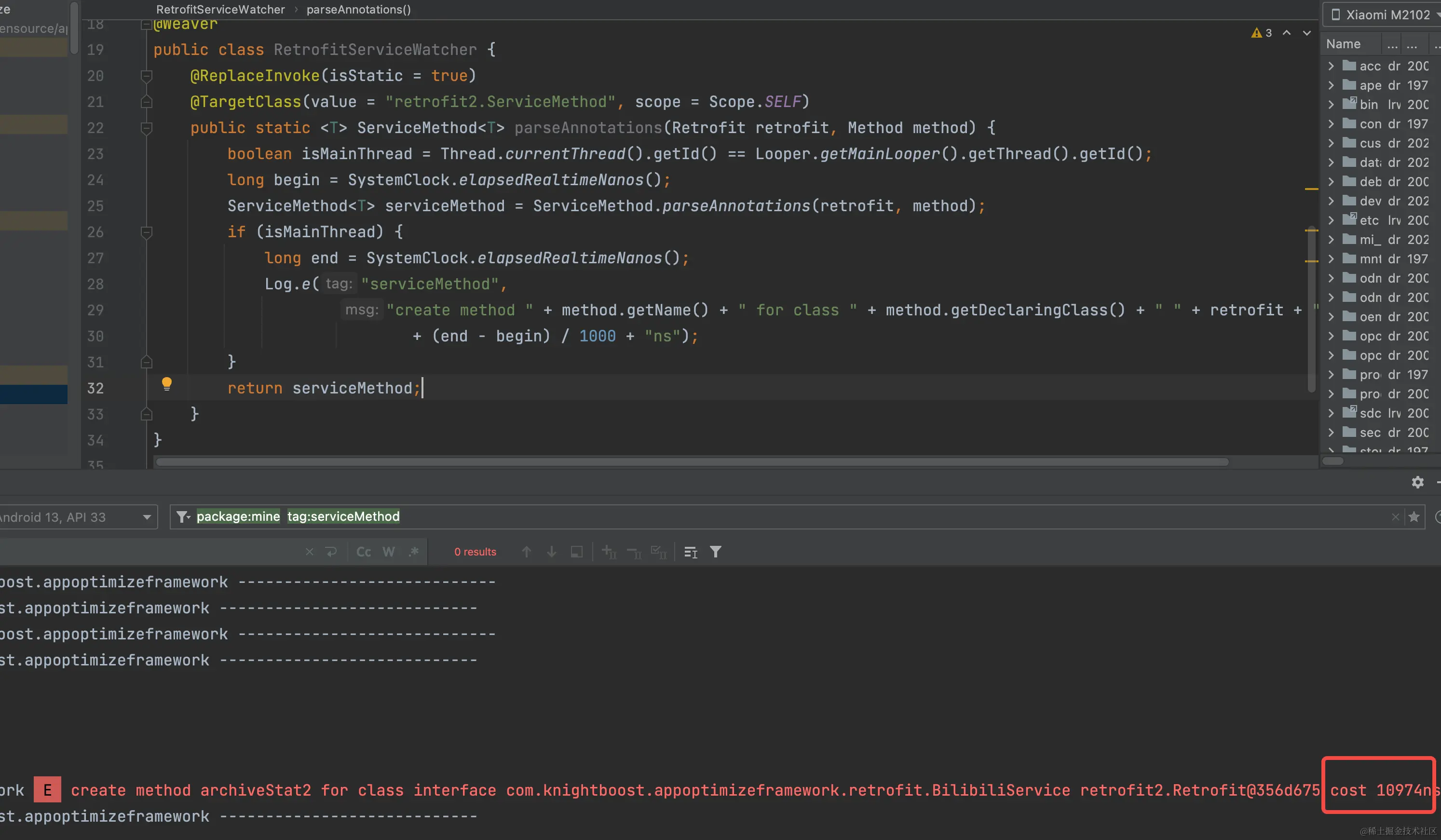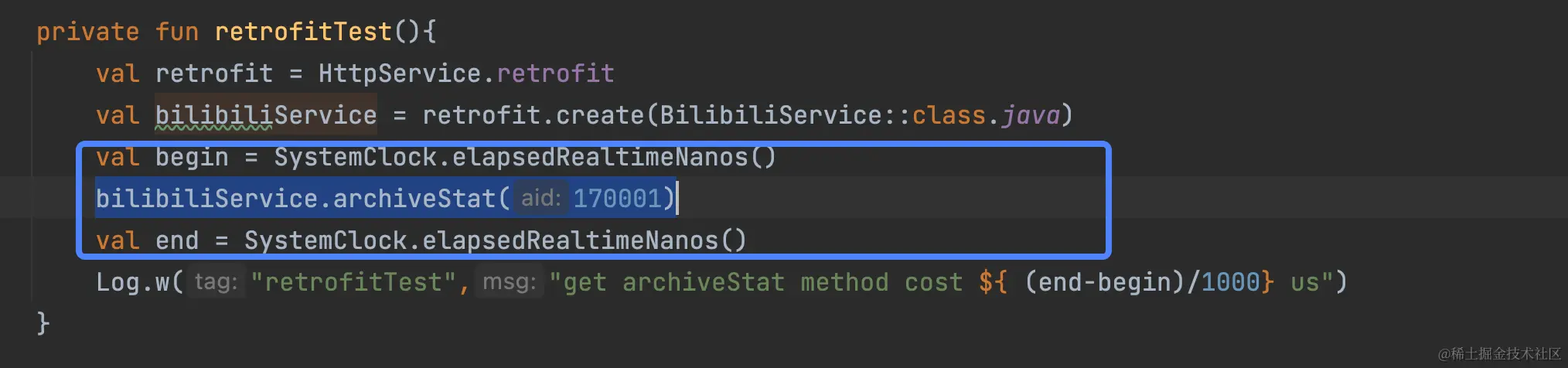 Log.d(TAG, "加载 ${clazz} 耗时 ${(end - begin) / 1000} 微秒 ,线程ID ${Thread.currentThread().id}")