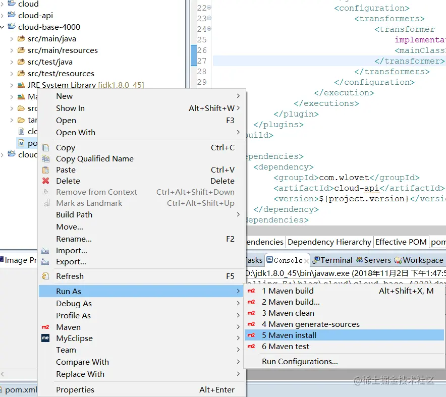 点击base服务的pom文件,右键—>Run As—>Maven Install,可以项目路径下的target文件夹中找到打包好的jar包