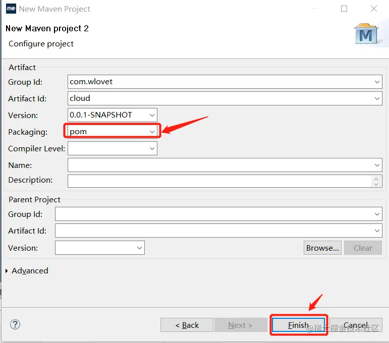 第三步:填入‘Group Id’和‘Artifact Id’,注意这边的‘Packaging’需要选择pom,不能选择jar或者war,然后点击Finish