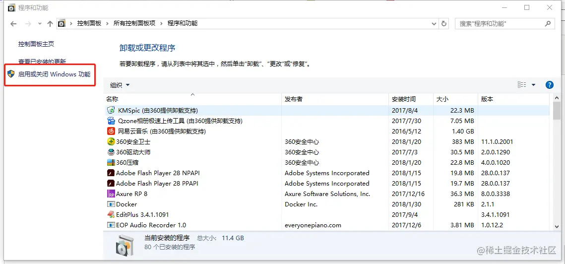 3、点击启用或关闭Windows功能——>找到Hyper-V并选中