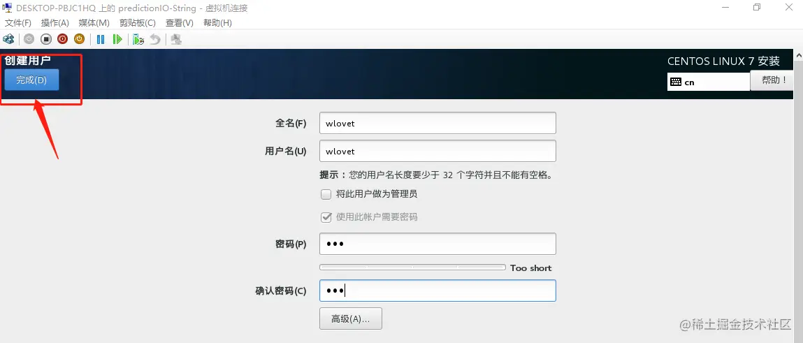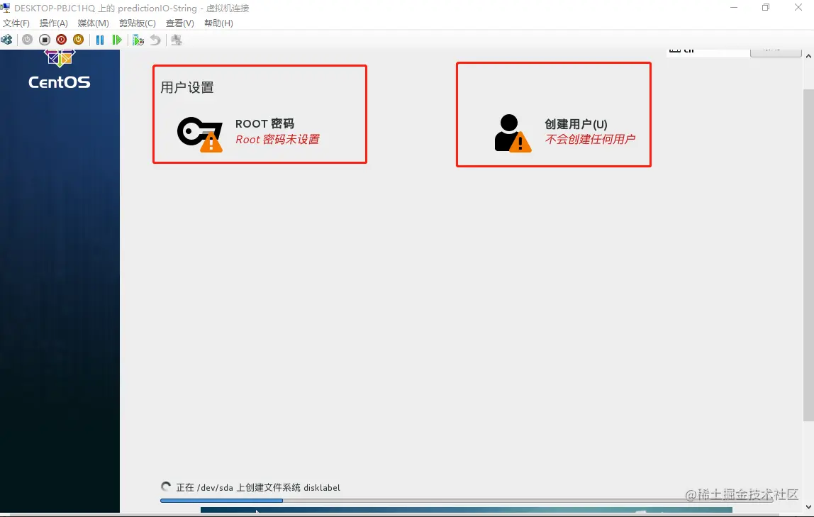 3、终于开始安装了,但别忘了设置用户名和密码——>先设置root用户,密码