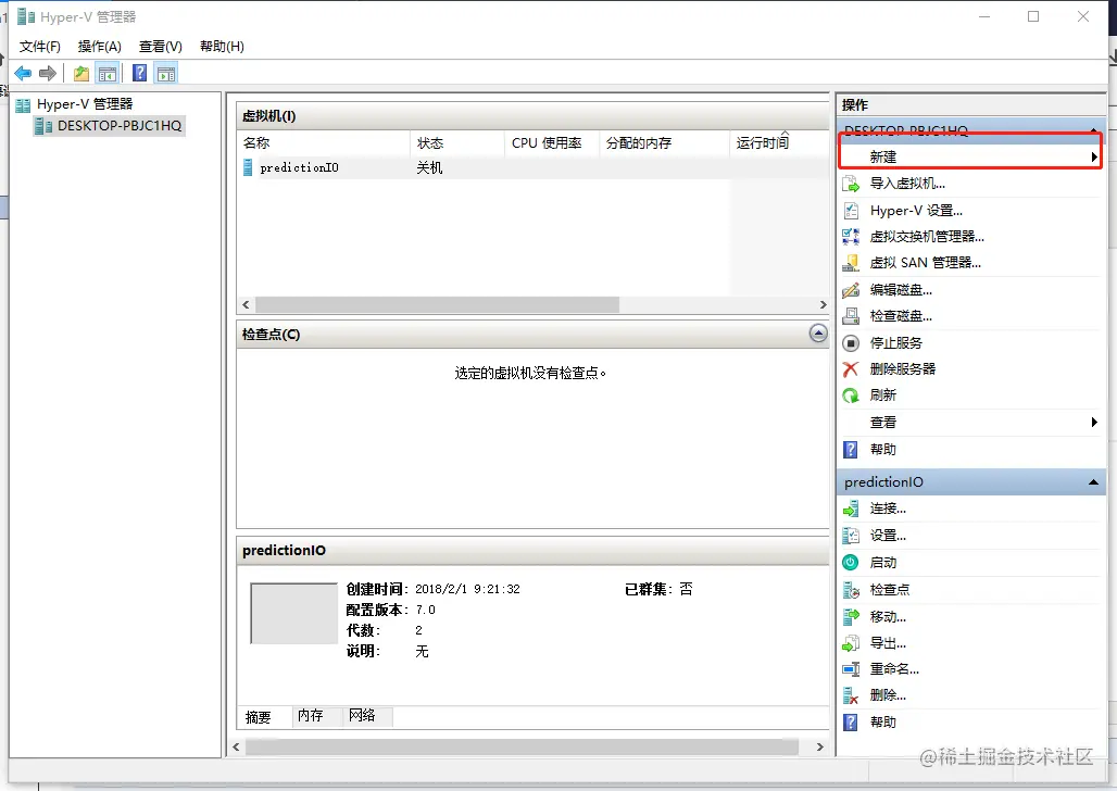 1、打开Hyper-V管理器——>点击新建虚拟机(或者选择你的主机名右击,也有新建)——>开始向导