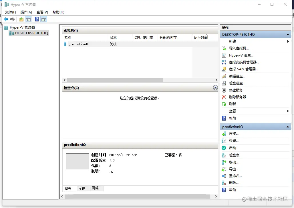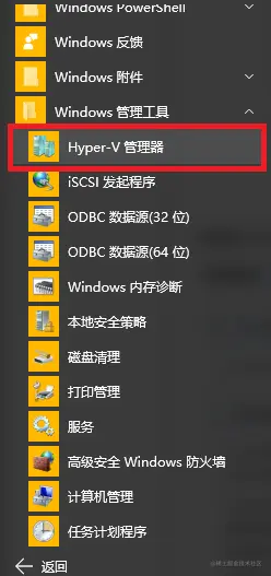 4、点击确定并重启后——>可在Windows管理工具处打开Hyper-V——>最后打开的界面如图