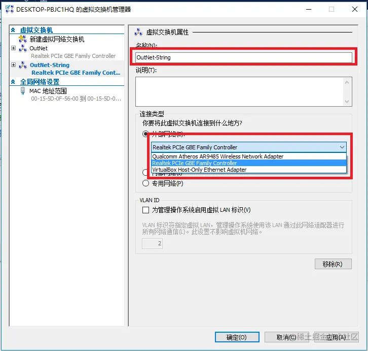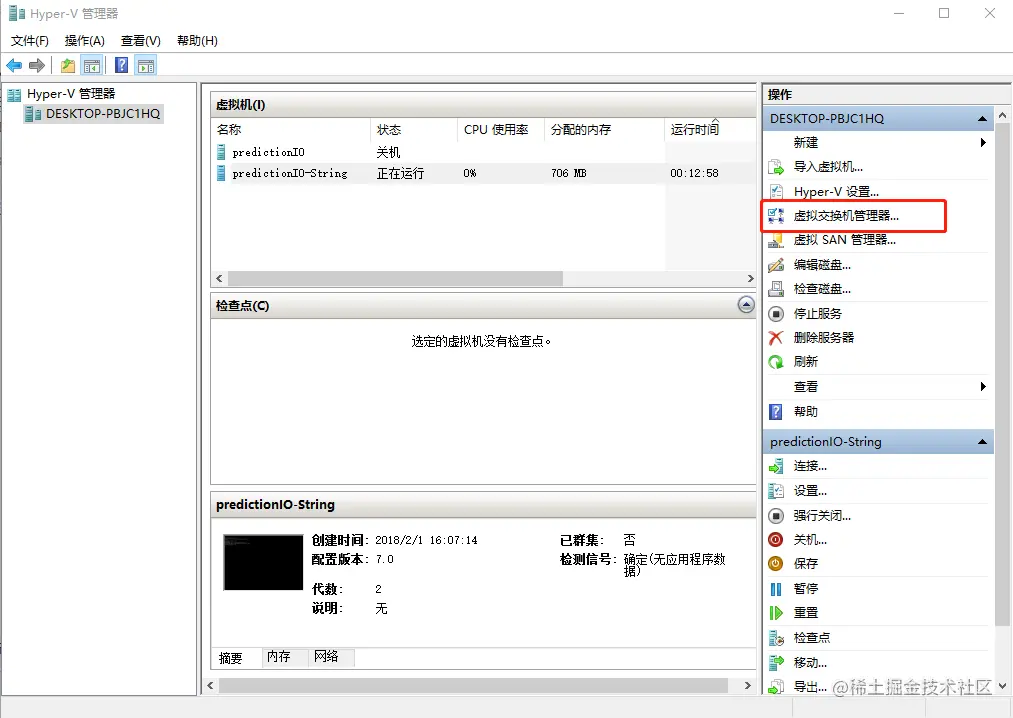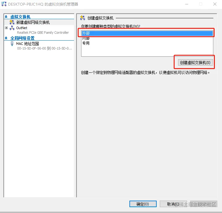 1、打开Hyper-V管理器界面,并选择虚拟交换机管理器 ——>选中外部网络,创建虚拟交换机