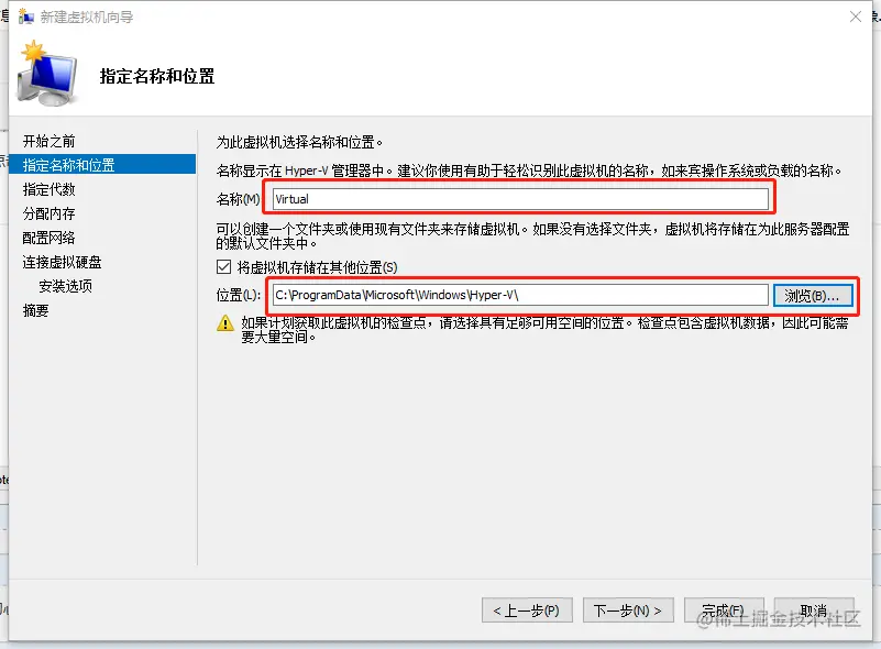 2、点击下一步——>取一个名称并且选择一个存储位置,点击下一步——>选择第二代,点击下一步