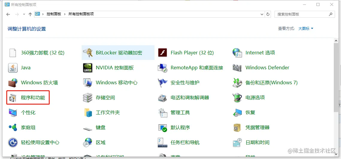 2、选择控制面板主页——>选择程序与功能