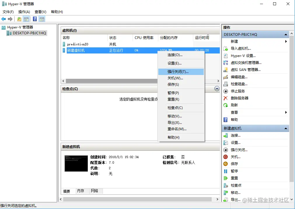 5、选中你新建的虚拟机,右击点击强行关闭