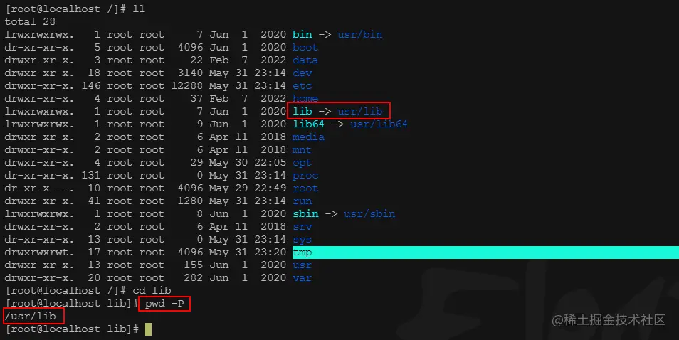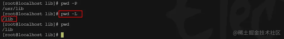 现在,我们 cd 进入其中一个,比如 cd lib,然后输入 pwd -P,就会显示当前符号链接指向的实际路径了。