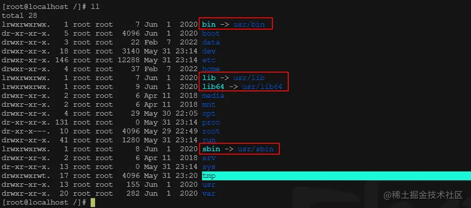 比如我们在根目录 / 下,可以发现有 4 个符号链接,分别是 bin、lib、lib64、sbin,且这 4 个符号链接分别指向 /usr/bin、/usr/lib、/usr/lib64、/usr/sbin