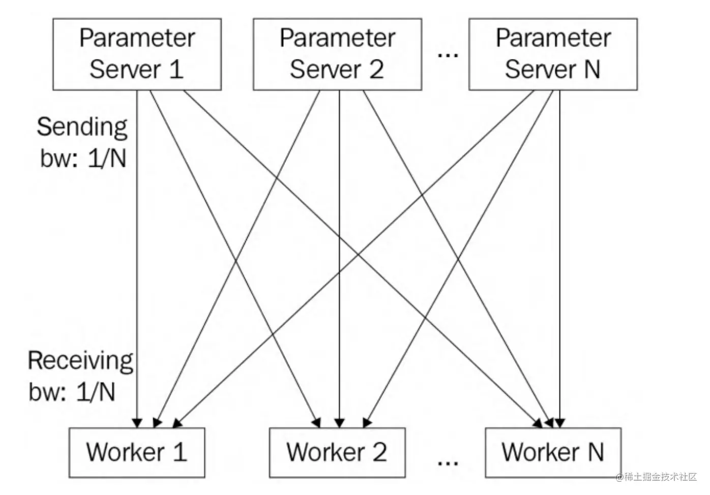 可见,上述的Pull Weights和Push Gradients涉及到通信,首先对于Pull Weights来说,参数服务器同时向worker发送权重,这是一对多的通信模式,称为fan-out通信模式。假设每个节点(参数服务器和工作节点)的通信带宽都为1。假设在这个数据并行训练作业中有N个工作节点,由于集中式参数服务器需要同时将模型发送给N个工作节点,因此每个工作节点的发送带宽(BW)仅为1/N。另一方面,每个工作节点的接收带宽为1,远大于参数服务器的发送带宽1/N。因此,在拉取权重阶段,参数服务器端存在通信瓶颈。