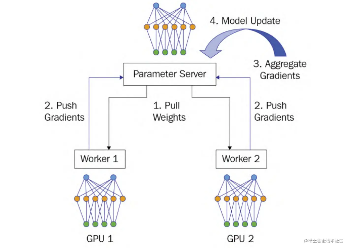 - Model Update:计算出累加梯度,参数服务器使用这个累加梯度来更新位于集中服务器上的模型参数