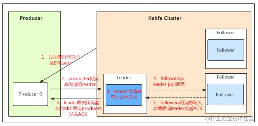 - producer往集群发送数据只要leader应答就可以发送下一条,只确保leader发送成功。