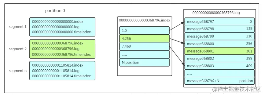 segment+有序offset+稀疏索引+二分查找+顺序查找