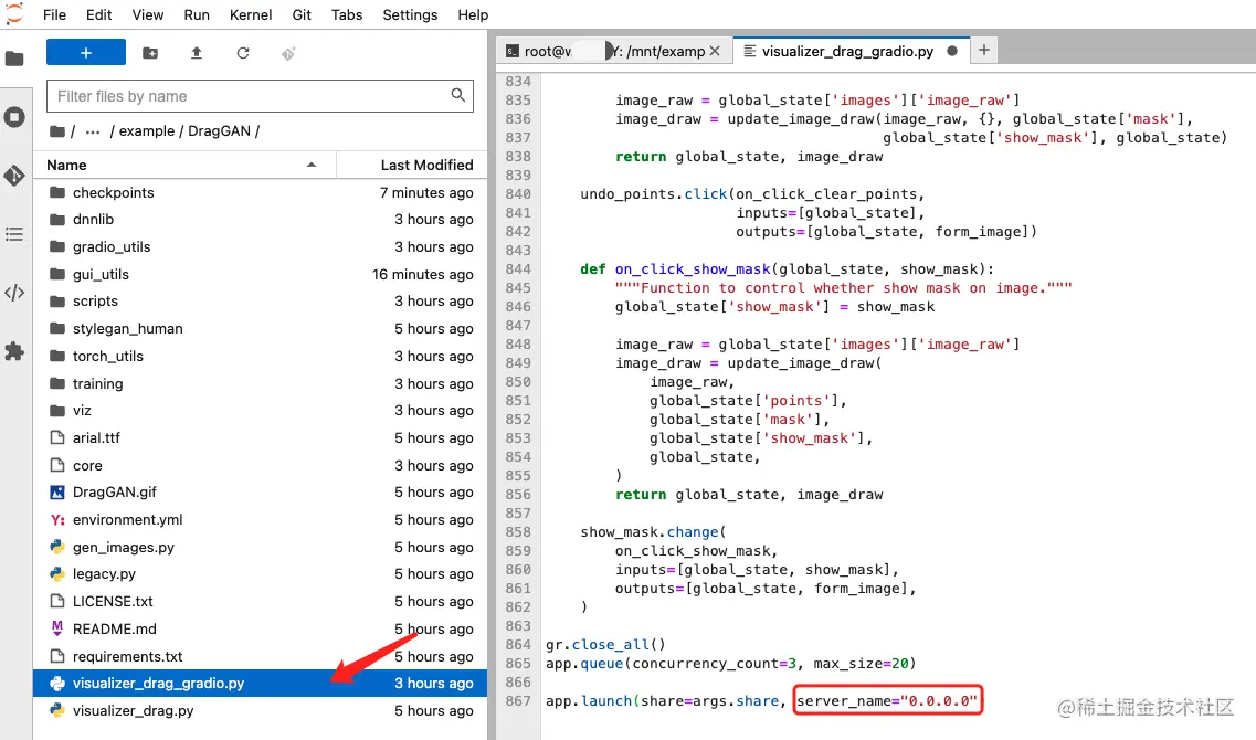 Jupyterlab 中打开项目文件夹下的visualizer_drag_gradio.py文件,移动到最后一行,在app.launch中添加server_name="0.0.0.0"即可解决前面说的问题。(如下图所示)