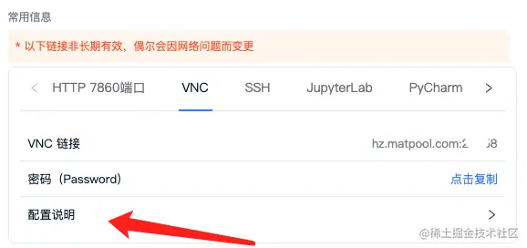 桌面程序需要在 VNC 里才能启动成功。复制 VNC 链接,按配置说明方法即可连接上 VNC 。