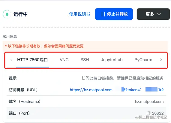 租用成功后我们可以在租用页面看到机器的自定义端口、VNC、SSH、Jupyterlab等链接,矩池云官网有详细的教程介绍了如何使用这些链接连接服务器。