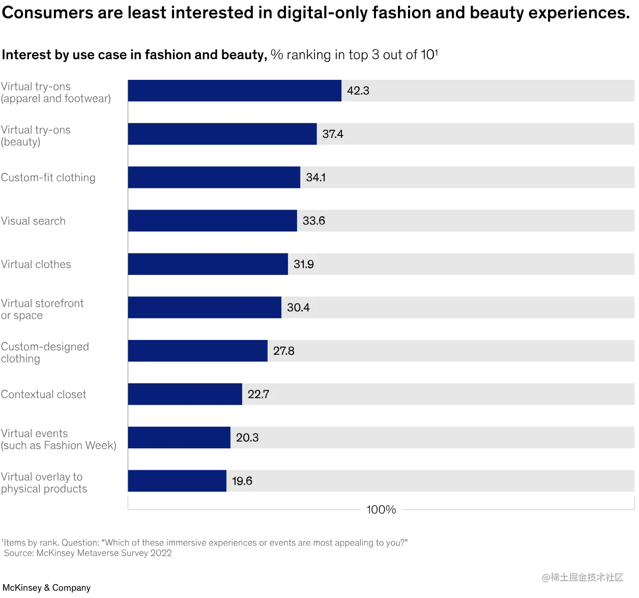 虽然大约50%的消费者将时尚和美容列为元宇宙电商的前两个类别,但目前的产品未能利用这种热情。许多品牌正在投资创造身临其境的、纯数字的元宇宙体验(特别是在服装和美容购物方面),但消费者对浏览数字商店的兴奋程度不如对增强物理世界购物体验的元宇宙应用程序感到兴奋。