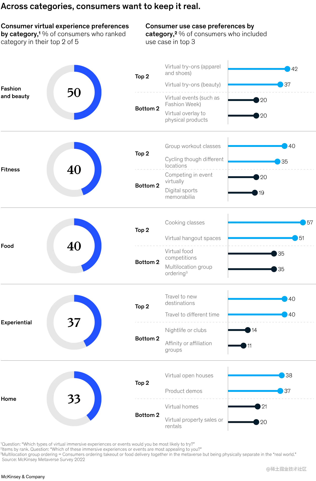 - 消费者想要现实世界的适用性。他们对元宇宙中与日常现实世界活动没有联系的产品或服务也不那么兴奋。例如,大约30%的消费者将他们对特定健身用例缺乏兴趣归因于对“现实生活”中的同一应用缺乏兴趣。相反,他们更喜欢连接物理和数字世界的“在家试穿”等用例。