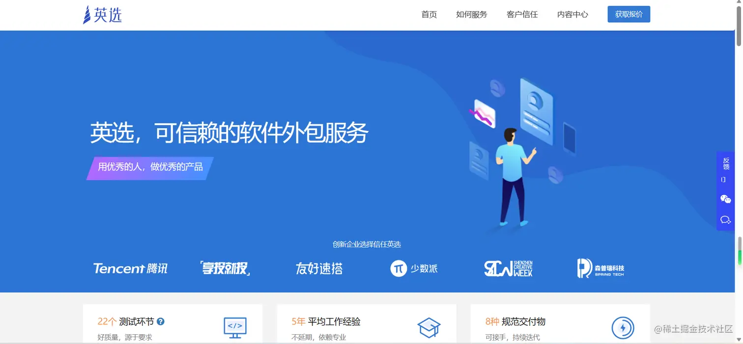 可信赖的软件外包服务,成功地给腾讯、少数派等企业提供优质的外包服务,程序员想在这个平台上兼职接单需要在英选上注册并验证,由于开发者人数较多,目前暂时不接受新的注册。