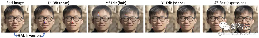 在真实图像的编辑中,团队应用GAN反转将其映射到StyleGAN的潜空间,然后分别编辑姿势、头发、形状和表情。