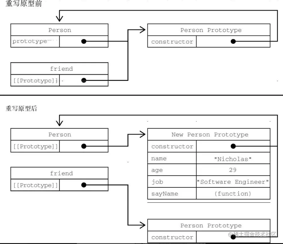 重写整个原型会切断最初原型与构造函数的联系,实例只有指向原型的指针,没有指向构造函数的指针