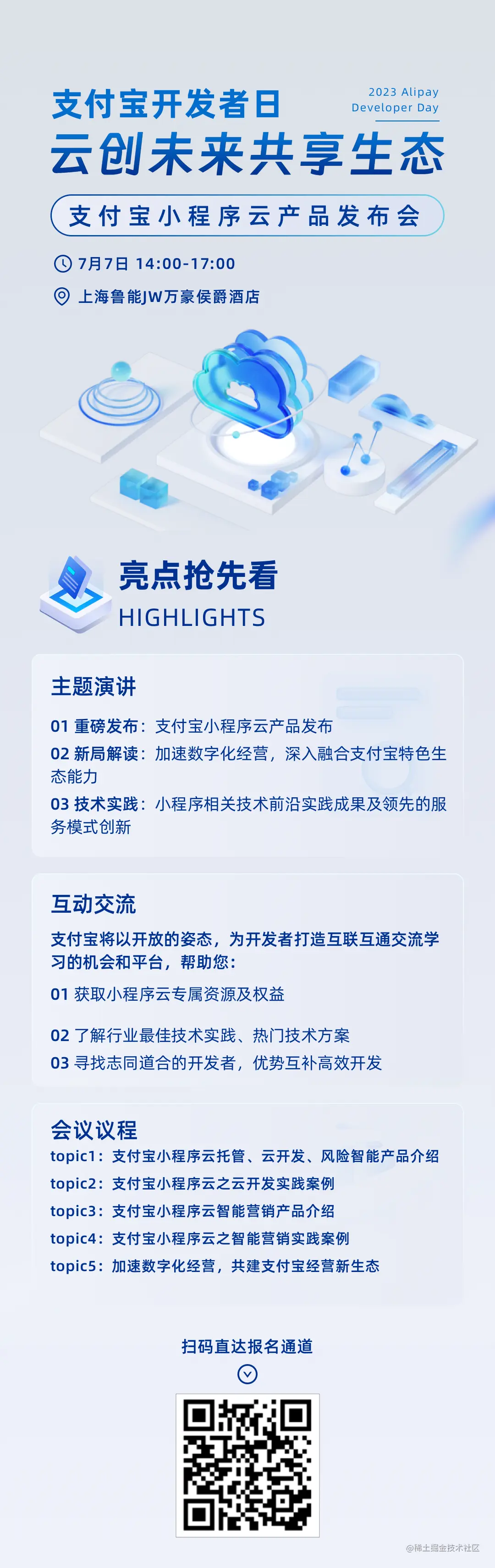 2023支付宝开发者日上海站将以“云创未来,共享生态”为主题,将战略发布支付宝小程序云产品、生态政策等,此外还有丰富的行业最佳实践分享、行业知名专家对话,探讨开放平台技术工具迭代,探索小程序的未来更多可能。
