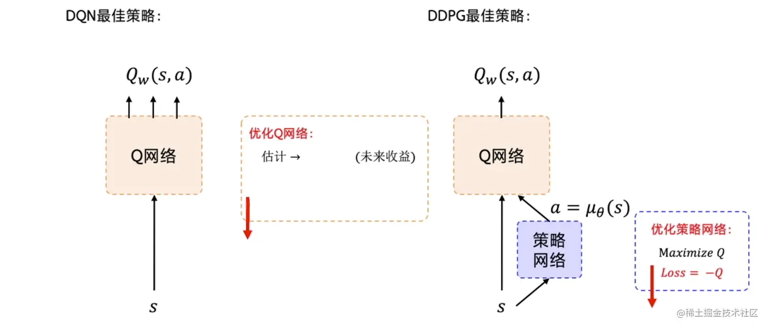深度Q网络与DDPG的联系如图 7.7 所示。深度Q网络 的最佳策略是想要学出一个很好的 Q 网络,学出这个网络之后,我们希望选取的那个动作使 Q 值最大。DDPG 的目的也是求解让 Q 值最大的那个动作。演员只是为了迎合评委的打分而已,所以优化策略网络的梯度就是要最大化这个 Q 值,所以构造的损失函数就是让 Q 取一个负号。我们写代码的时候把这个损失函数放入优化器里面,它就会自动最小化损失,也就是最大化 Q。