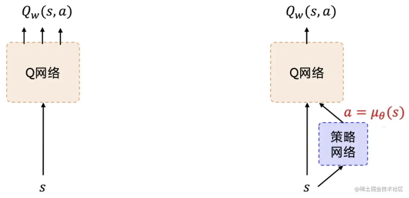 我们再对随机性策略与确定性策略进行解释。对随机性策略来说,输入某一个状态 ,采取某一个动作的可能性并不是百分之百的,而是有一个概率的(就好像抽奖一样),根据概率随机抽取一个动作。而对于确定性策略来说,它不受概率的影响。当神经网络的参数固定之后,输入同样的状态,必然输出同样的动作,这就是确定性策略。