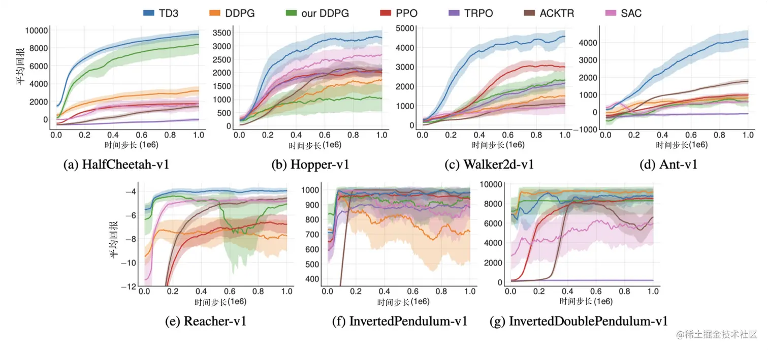 如图 7.10 所示,我们可以将 TD3 算法与其他算法进行对比。TD3算法的作者自己实现的 深度确定性策略梯度(图中为our DDPG)和官方实现的 DDPG 的表现不一样,这说明 DDPG 对初始化和调参非常敏感。TD3对参数不是这么敏感。在TD3的论文中,TD3的性能比**软演员-评论员(soft actor-critic,SAC)**高。软演员-评论员又被译作软动作评价。但在SAC的论文中, SAC 的性能比TD3 高,这是因为强化学习的很多算法估计对参数和初始条件敏感。