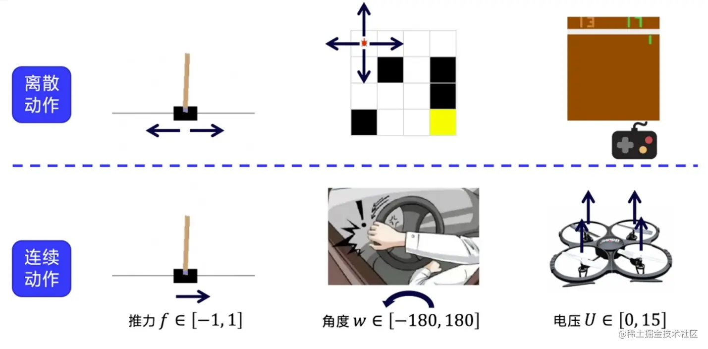 离散动作与连续动作是相对的概念,一个是可数的,一个是不可数的。 如图 7.1 所示,离散动作和连续动作有几个例子。在 CartPole 环境中,可以有向左推小车、向右推小车两个动作。在 Frozen Lake 环境中,小乌龟可以有上、下、左、右4个动作。在雅达利的 Pong 游戏中,游戏有 6 个按键的动作可以输出。但在实际情况中,我们经常会遇到连续动作空间的情况,也就是输出的动作是不可数的。比如:推小车推力的大小、选择下一时刻方向盘转动的具体角度、给四轴飞行器的4个螺旋桨给的电压的大小。