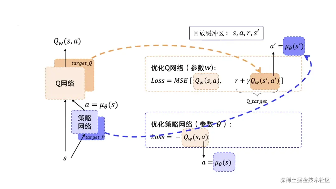 这里训练需要用到的数据就是 、、、,我们只需要用到这4个数据。我们用回放缓冲区把这些数据存起来,然后采样进行训练。经验回放的技巧与 深度Q网络 中的是一样的。注意,因为 DDPG 使用了经验回放技巧,所以 DDPG 是一个异策略的算法。
