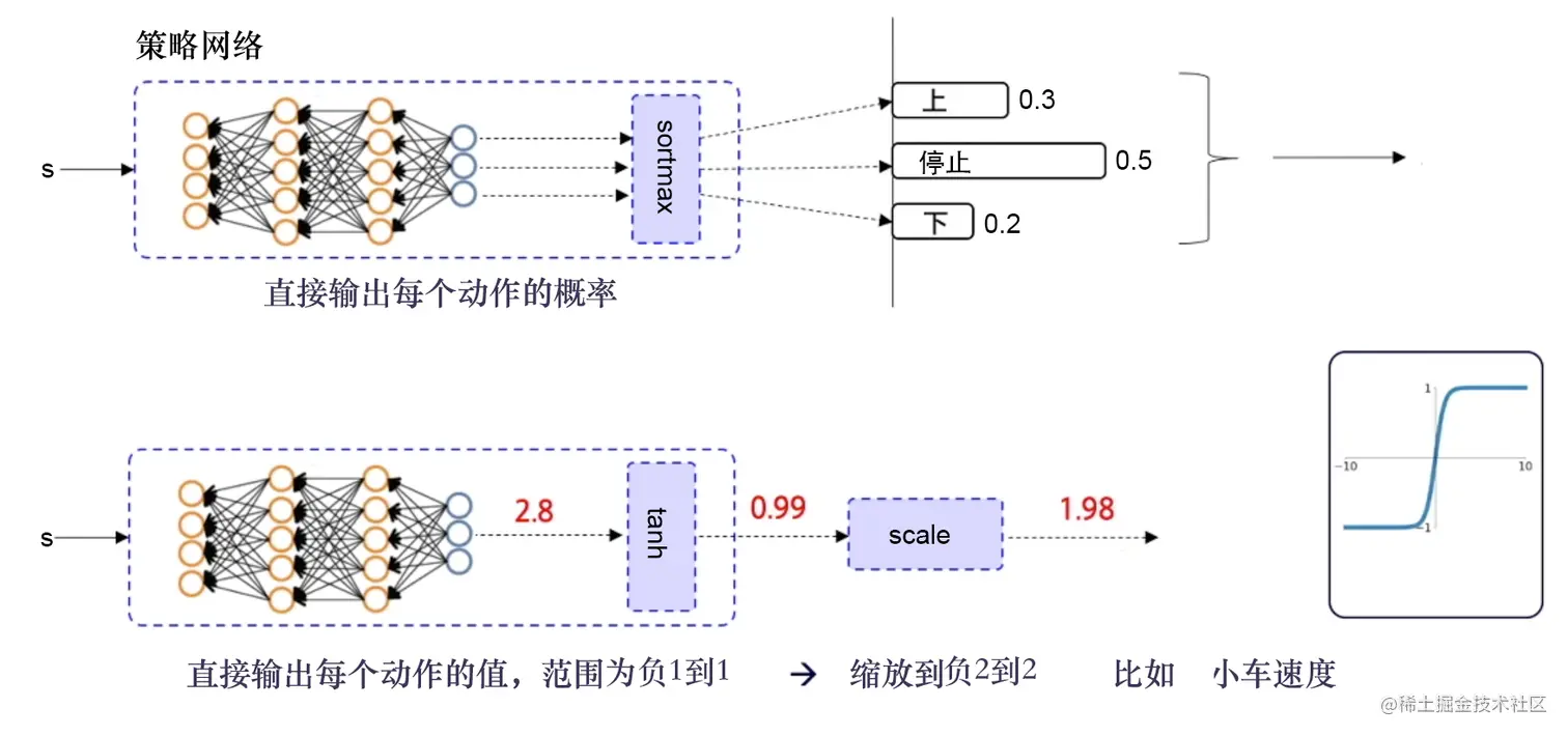 如图 7.3 所示,要输出离散动作,我们就加一个 softmax 层来确保所有的输出是动作概率,并且所有的动作概率和为 1。要输出连续动作,我们一般可以在输出层加一层 tanh 函数。tanh 函数的作用就是把输出限制到 [1,1] 。我们得到输出后,就可以根据实际动作的范围将其缩放,再输出给环境。比如神经网络输出一个浮点数 2.8,经过 tanh 函数之后,它就可以被限制在 [1,1] 之间,输出 0.99。假设小车速度的范围是 [2,2] ,我们就按比例从 [1,1] 扩大到 [2,2],0.99 乘 2,最终输出的就是 1.98,将其作为小车的速度或者推小车的推力输出给环境。