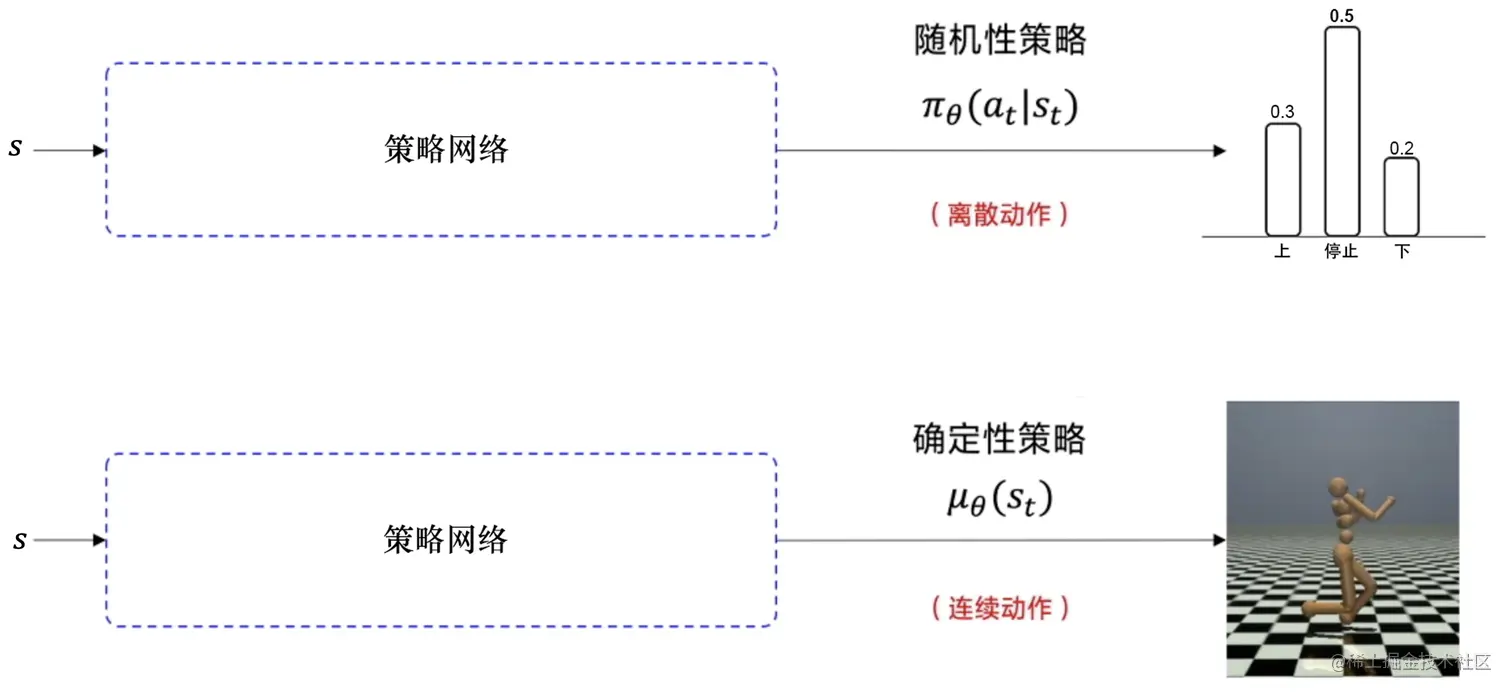 对于这些连续的动作,Q学习、深度Q网络等算法是没有办法处理的。那我们怎么输出连续的动作呢?这个时候,“万能”的神经网络又出现了。如图 7.2 所示,在离散动作的场景下,比如我们输出上、下或是停止这几个动作。有几个动作,神经网络就输出几个概率值,我们用 来表示这个随机性的策略。在连续的动作场景下,比如我们要输出机械臂弯曲的角度,我们就输出一个具体的浮点数。我们用 来代表这个确定性的策略。