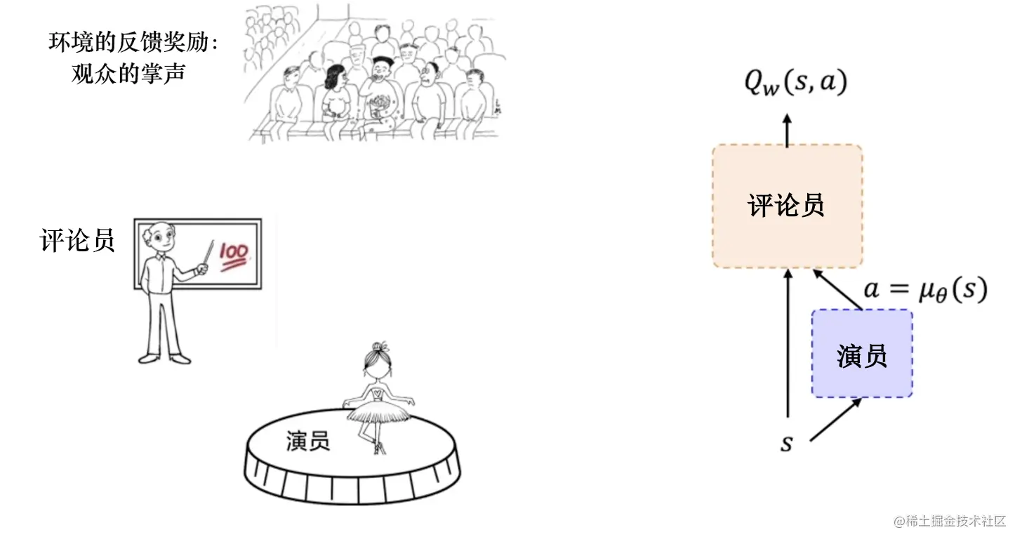 最开始训练的时候,这两个神经网络的参数是随机的。所以评论员最开始是随机打分的,演员也随机输出动作。但是由于有环境反馈的奖励存在,因此评论员的评分会越来越准确,所评判的演员的表现也会越来越好。既然演员是一个神经网络,是我们希望训练好的策略网络,我们就需要计算梯度来更新优化它里面的参数 。简单来说,我们希望调整演员的网络参数,使得评委打分尽可能高。注意,这里的演员是不关注观众的,它只关注评委,它只迎合评委的打分 。