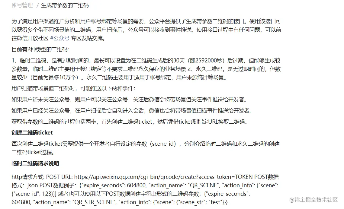生成带参数的二维码以及用户标识接口,生成带参数的二维码主要根据公众号提供的接口文档中生成带参数的二维码这个接口,以此当用户扫码后点击关注,服务端便可以接收到用户的关注事件。如果是已关注用户扫码,服务端就会接收到扫码事件,下面是生成参数二维码后的扫码事件相关说明。