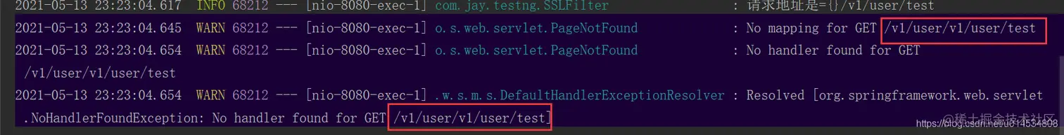 加上这两个配置之后,在访问接口的话,控制台就会打印出如下的错误日志:我们看到在查找mapping时url就变成了 /v1/user/v1/user/test,不是我们期待的 /v1/user/test。