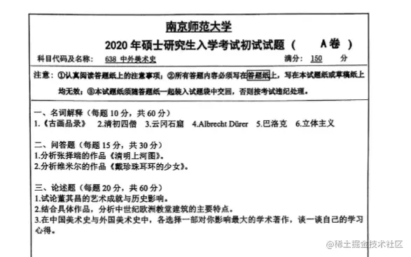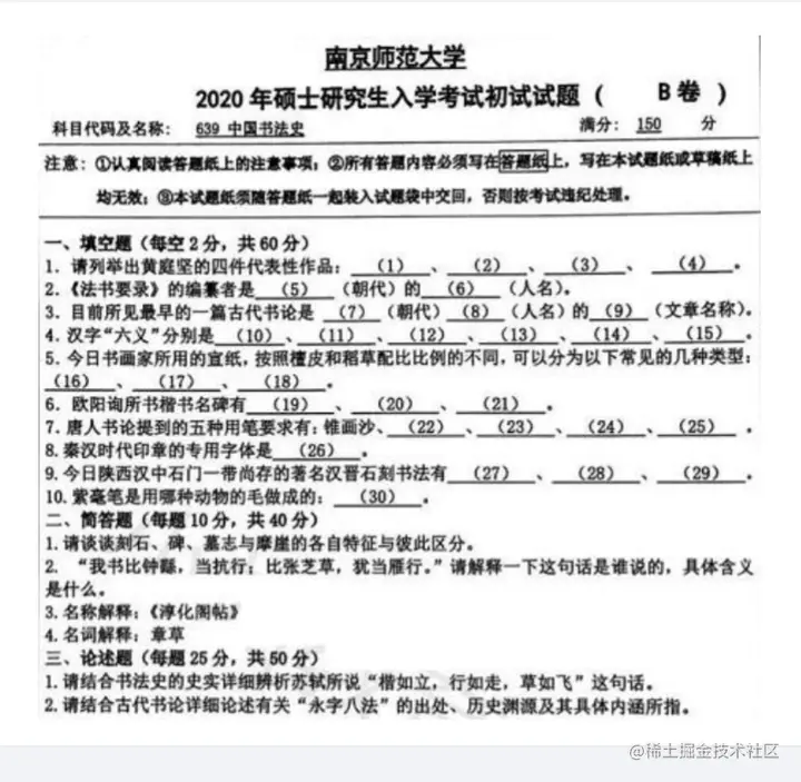 【考研真题】南京师范大学32个热门专业(上) ChatGPT云炬学长 2023-06-27 204 阅读1分钟 南京师范大学640书法史与书法理论 2019 年南京师范大学书法史论考题 名词解释: 隶变 鸿都门学 《平复帖》 帖学 简答题 1、中国书法史中楷书的主要书风类型,请简述 2、今草和章草的主要区别有哪些 论述题 1、请谈谈你对三大行书的认识和理解 2、请 分析 清代 碑学 兴起 的具 体原 南京师范大学638体育学基础综合 南京师范大学241日语(二外) 南京师范大学859美术教育学 南京师范大学639中外美术史 南京师范大学613新闻传播史论 南京师范大学842物理化学 南京师范大学844细胞生物学