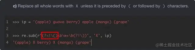 在这个例子中,字符串"ip = '(apple) guava berry) apple (mango) (grape'"中的单词"apple"、"guava"、"berry"、"mango"和"grape"都被匹配到了,并且被替换为了'X'。因此,输出结果是"(apple) X berry) X (mango) (grape"。