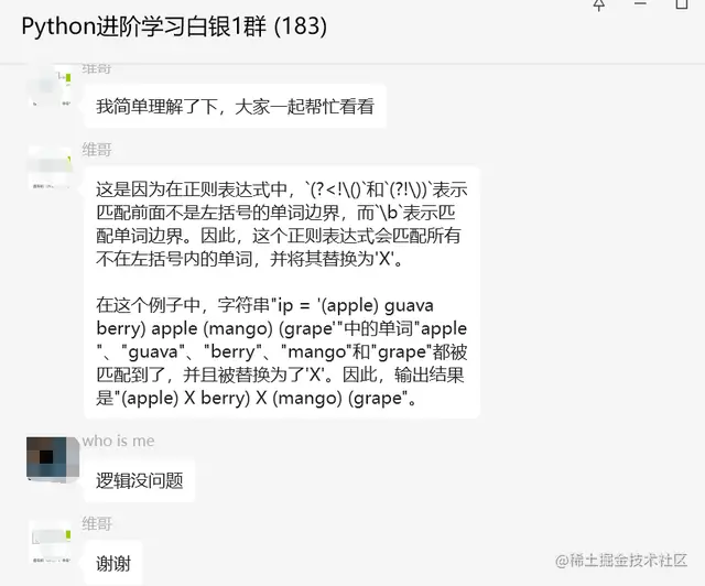 后来【魏哥】补充了下:这是因为在正则表达式中,(?<!\()和(?!\))表示匹配前面不是左括号的单词边界,而\b表示匹配单词边界。因此,这个正则表达式会匹配所有不在左括号内的单词,并将其替换为'X'。