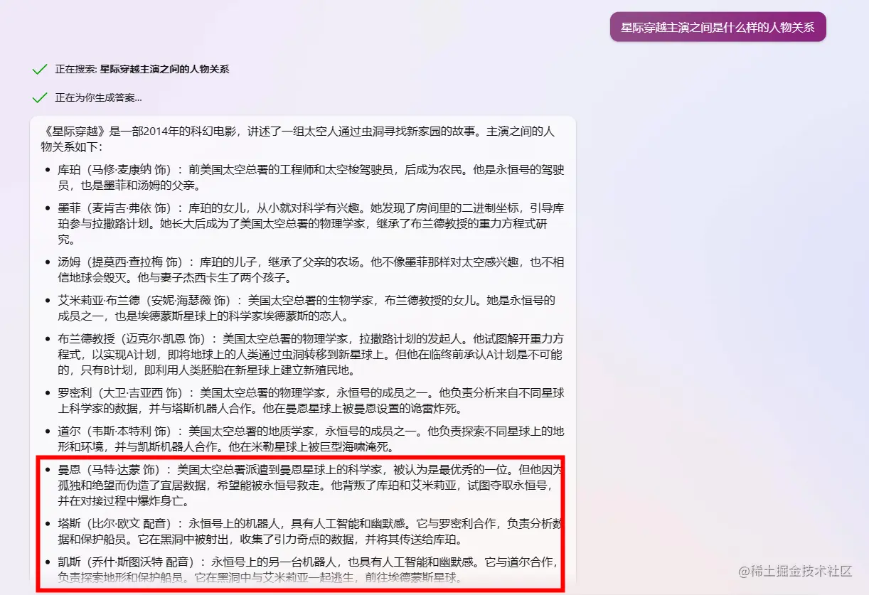假设用户的问题是:“《星际穿越》主演之间是什么样的人物关系?”