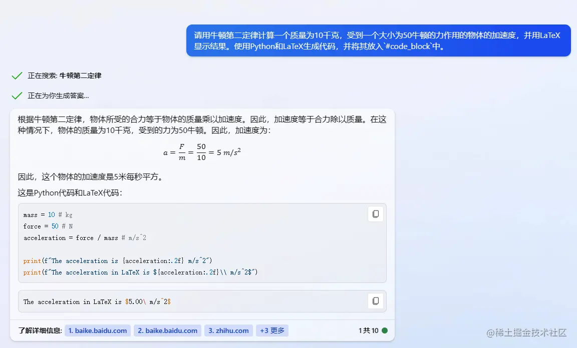 代码执行的一个很好的应用场景是进行数学或物理方面的计算。例如,如果用户询问关于一些公式或定理的问题,我们可以让模型生成相应的代码,并使用LaTeX来显示结果。这样可以避免模型在计算过程中出现错误或不精确。