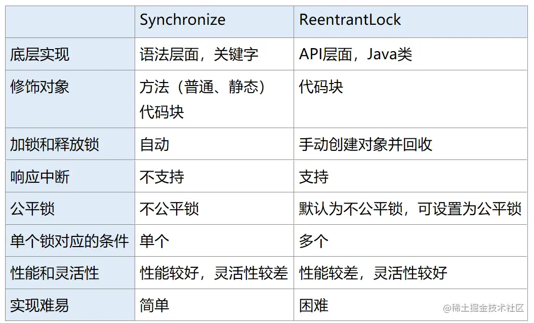 Sychronize是JVM层面的同步锁,实现简单,性能较好; ReentrantLock是API层面的同步锁,需要手动创建和释放锁,性能较差,但是增加了很多特点,灵活性较好。