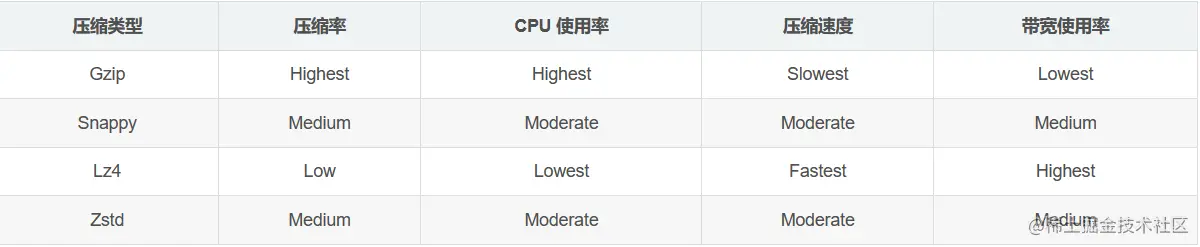 Kafka 共支持四种主要的压缩类型:Gzip、Snappy、Lz4 和 Zstd,具体效率对比如下:
