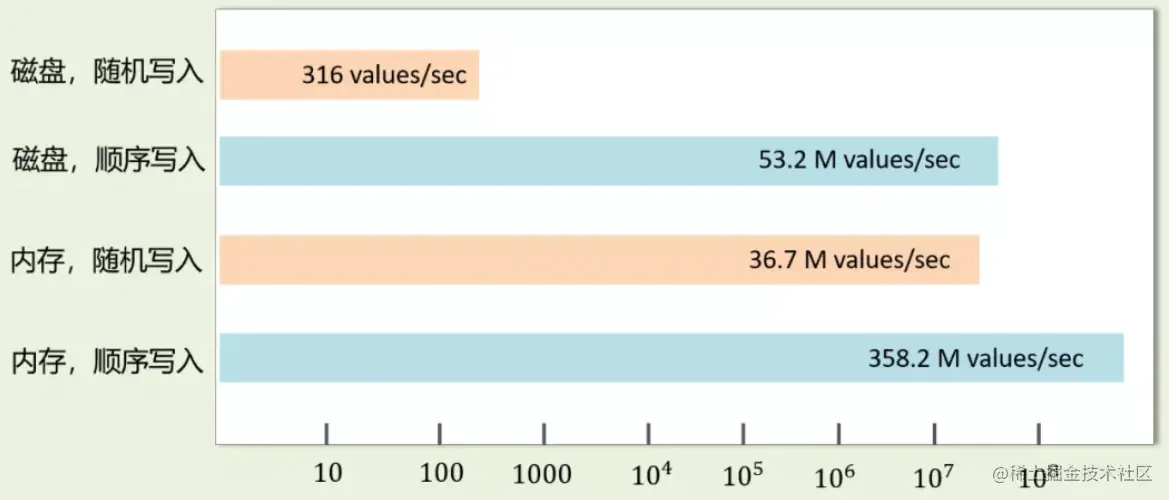 前两个,即寻找数据位置的过程为机械运动。我们常说硬盘比内存慢,主要原因是这两个过程在拖后腿。不过,硬盘比内存慢是绝对的吗?其实不然,如果我们能通过顺序读写减少寻找数据位置时读写磁头的移动距离,硬盘的速度还是相当可观的。一般来讲,IO速度层面,内存顺序IO > 磁盘顺序IO > 内存随机IO > 磁盘随机IO。这里用一张网上的图来对比一下相关IO性能: