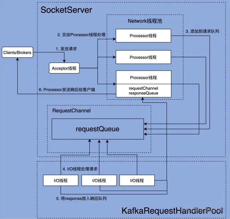 - SocketServer:主要实现了 Reactor 模式,用于处理外部多个 Clients(这里的 Clients 指的是广义的 Clients,可能包含 Producer、Consumer 或其他 Broker)的并发请求,并负责将处理结果封装进 Response 中,返还给 Clients