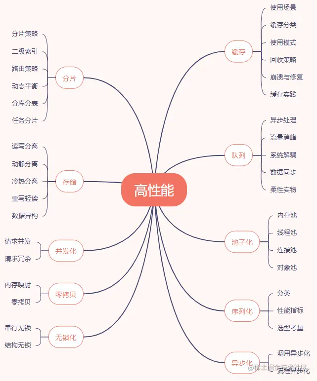先抛开kafka,咱们先来谈论一下高性能设计的本质,在这里借用一下网上的一张总结高性能的思维导图: