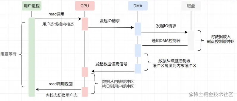 - 用户应用进程调用read函数,向操作系统发起IO调用,上下文从用户态转为内核态(切换1)