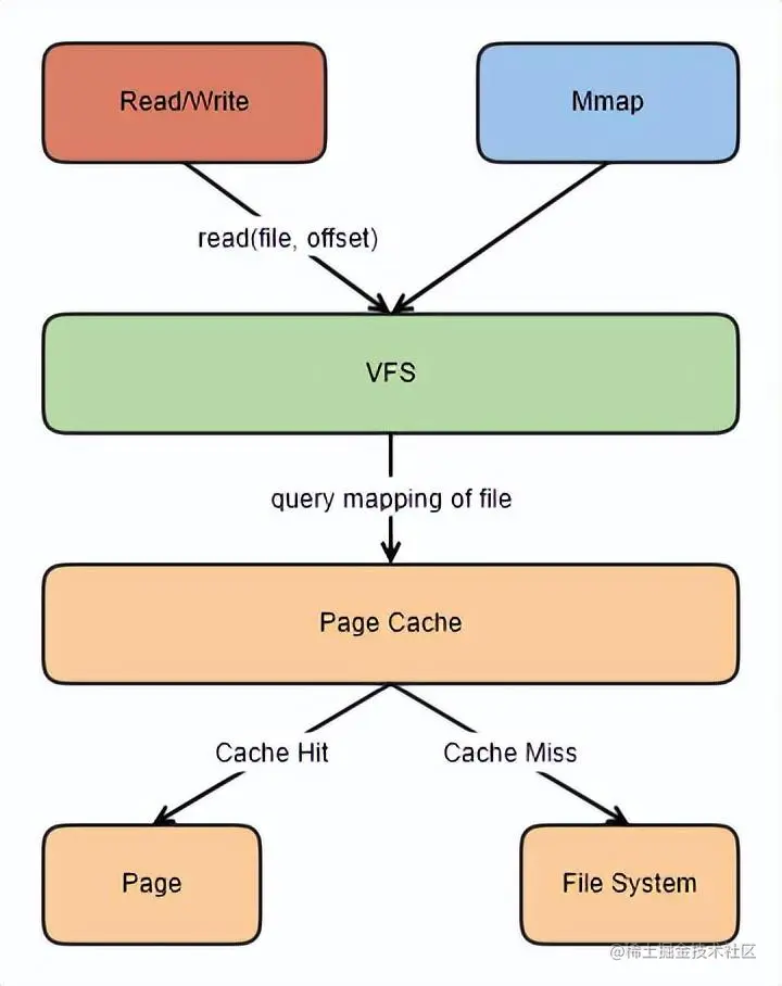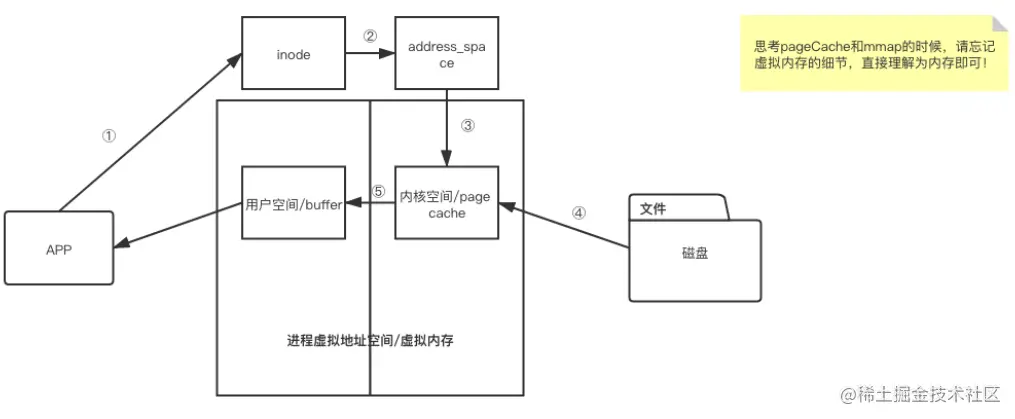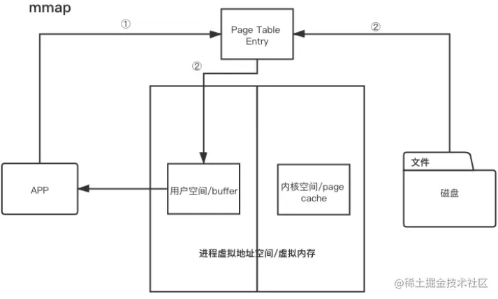 - 读操作引发缺页异常,通过inode找到磁盘地址,将文件内容拷贝到用户空间,此处不涉及内核态和用户态的切换